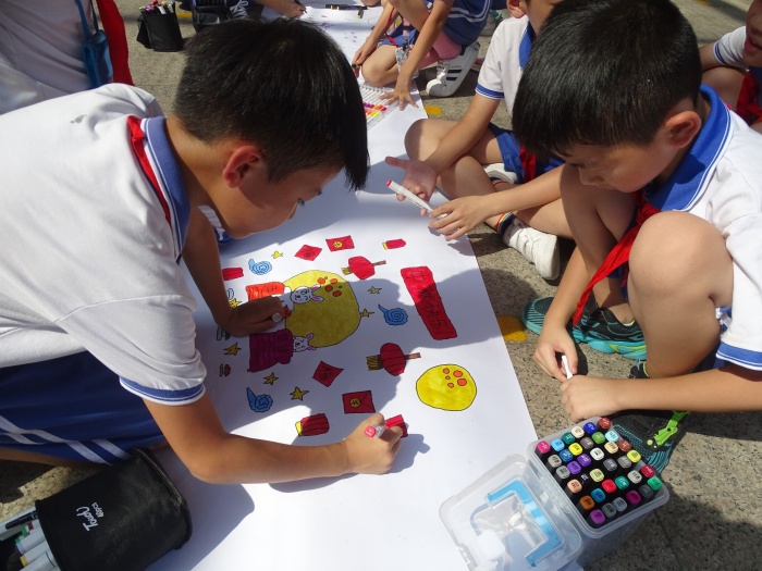 此次活動以周瑞珍校長為總指揮,德育處、教導(dǎo)處做好前期部署,不同年級分別開展不同的活動。一至三年級的學(xué)生變身小小藝術(shù)家,開動腦筋,親手制作一張張精美的紙盤創(chuàng)意繪畫,紙盤上有各種各樣的圖案,如嫦娥、玉兔、月亮等等,構(gòu)圖有趣,顏色鮮艷,一筆一畫充滿著濃濃的中秋情。四五年級的學(xué)生進(jìn)行“百人畫長畫”活動,場面壯觀。學(xué)生想象豐富,以自己的視角,用小小的畫筆表達(dá)對中秋節(jié)深深的祝福!六年級的學(xué)生猜燈謎,校園內(nèi)的小操場、棋藝園內(nèi)懸掛著彩帶,100多條燈謎競相爭輝,謎面科學(xué)而通俗、生動而活潑,有猜字的、有猜成語的、有猜人名的、有猜地名的……燈謎涉及的面廣而量大。學(xué)生認(rèn)真思考,熱烈討論,紛紛猜對燈謎,兌換一份心儀的獎品。校園內(nèi)一片歡聲笑語,全校學(xué)生玩得不亦樂乎!