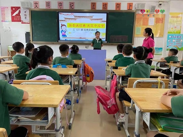 推普周里,五桂山學(xué)校一至六年級(jí)都開(kāi)展了“推普誦經(jīng)典,共筑中國(guó)夢(mèng)”的經(jīng)典誦讀大賽。一年級(jí)的同學(xué)童聲稚嫩,卻能瑯瑯上口誦讀著《大風(fēng)歌》 《詠鵝》 《江南》等小學(xué)生必背的75首古詩(shī),這也得益于學(xué)校一貫重視學(xué)生中華優(yōu)秀傳統(tǒng)文化的培養(yǎng)與傳承。中高年級(jí)的同學(xué)們自信滿滿地背誦著自己喜愛(ài)的古詩(shī)。詩(shī)詞大會(huì)的舉辦,讓同學(xué)們領(lǐng)悟到了中華詩(shī)詞的獨(dú)特魅力,領(lǐng)略到華夏文化的博大精深。更明白了說(shuō)好普通話的重要意義,關(guān)注了普通話的標(biāo)準(zhǔn)發(fā)音,更嚴(yán)格地要求自己說(shuō)話字正腔圓,提高了語(yǔ)言表達(dá)的能力,更加熱愛(ài)祖國(guó)的文字。