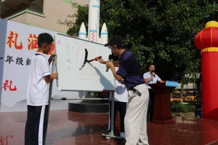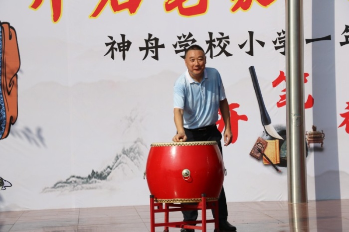 活動(dòng)開(kāi)始,一年級(jí)的新同學(xué)們就在父母的陪伴下穿過(guò)“智慧門”,進(jìn)入會(huì)場(chǎng)。接著神舟學(xué)校德育處韋德敏主任宣布“開(kāi)筆禮”活動(dòng)正式開(kāi)始。神舟學(xué)校高華副校長(zhǎng)首先致詞,高華校長(zhǎng)表示:今天我們結(jié)合時(shí)代的特點(diǎn),古為今用,古今結(jié)合,并有所創(chuàng)新地舉行開(kāi)筆禮儀式,目的就是想通過(guò)這種莊重的儀式,讓剛?cè)雽W(xué)的一年級(jí)小朋友真正感受到入學(xué)是人生中的一件大事,是開(kāi)始學(xué)習(xí),走向成才的起點(diǎn),要以此激勵(lì)同學(xué)們珍惜讀書機(jī)會(huì)、勤奮學(xué)習(xí);同時(shí)又通過(guò)這種特別的方式弘揚(yáng)我國(guó)優(yōu)良的傳統(tǒng)文化。高華校長(zhǎng)講話結(jié)束后,主持人又組織大家依次開(kāi)展了“正衣冠”、行“拜師禮”、點(diǎn)朱砂啟智、擊鼓明智及啟蒙描紅活動(dòng),這五個(gè)頗具歷史傳統(tǒng)意義的環(huán)節(jié),讓孩子們感受到了傳統(tǒng)文化的魅力。