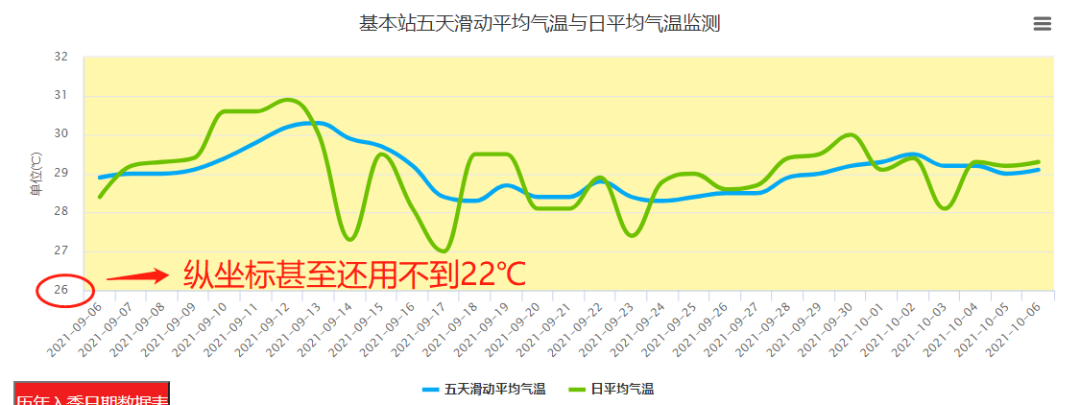 按照氣候?qū)W標準,當五天滑動平均氣溫≤22℃時才算入秋,并且以滿足條件的五天中首個日平均氣溫≤22℃那天作為入秋日。